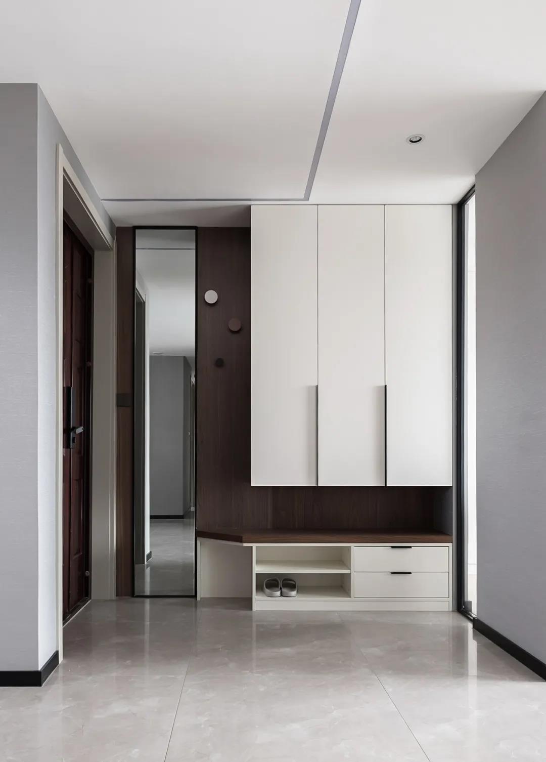 家裝設計玄關裝修效果圖,現代極簡風格室內家裝設計,玄關處的柜子的功能區分布井然有序,穿衣鏡頂天立地有棱有角,胡桃色飾面板上的圓形掛鉤將空間變得圓融