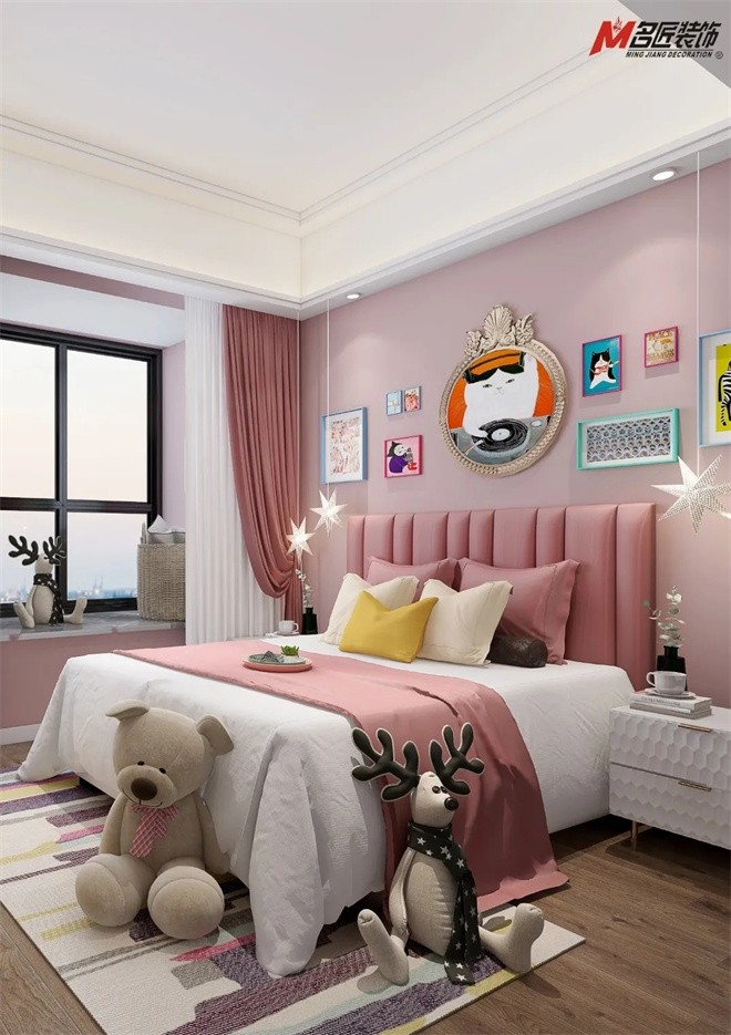 兒童房間以粉色和白色相互交融,這樣溫馨的童心未泯,屬于童真純潔的空間。暖心的床品,溫馨的星星燈可以守護(hù)你每一個(gè)晚上的美夢。
