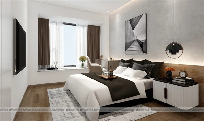 步入臥室,以木質背景墻做滿床頭,搭配前衛的裝飾畫,北歐風灰色調墻布,立體吊燈點綴,整體自然協調。清晨的陽光從窗戶透進來,灑在了潔白的被子上,這片刻的溫柔令人沉醉。