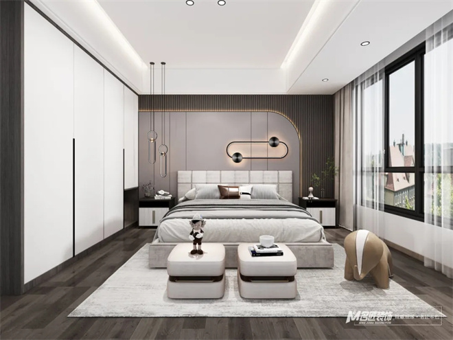 臥室中色彩靈活運(yùn)用,形成自然靈動(dòng)又不失沉靜的環(huán)境,大面落地窗保證了空氣,光影與人動(dòng)線的流暢性