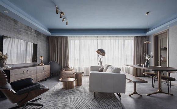 不想動側面的白墻,天花板刷上這種霧霾藍效果也特別好。一大片純凈,有如頭頂星空、面朝浩瀚大海。地上黃銅色桌椅進一步提升檔次,時尚又簡約。