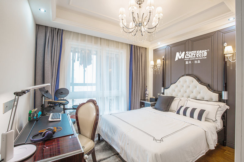 男孩房兼具學習與休息功能,并結合孩子的特長愛好,在房間里加入了外表酷炫的架子鼓,以簡化的線條裝飾展現新古典主義開放、創新的特點。