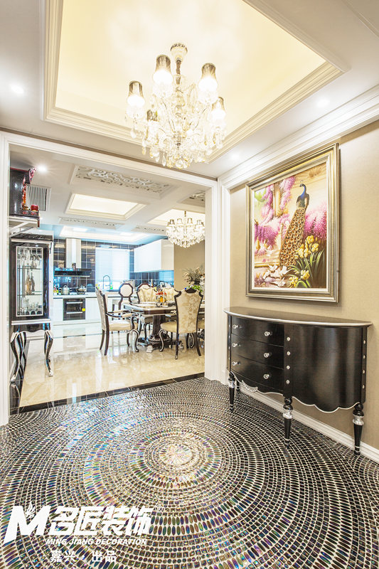 從進門處就能感受到設計的精細與大膽,地面采用上千枚鵝卵石一顆顆鋪貼開來,層層圍繞的環形地面在水晶燈的照射下散發五彩斑斕的光芒。