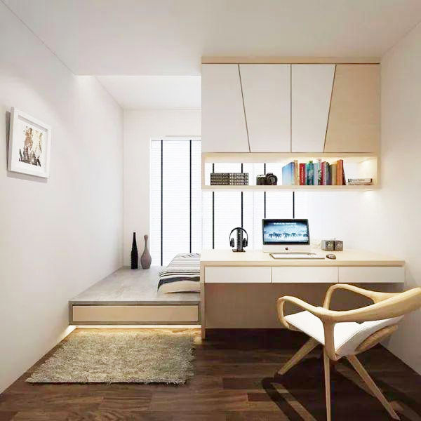 房間極小,不論放什么都只剩轉(zhuǎn)身的位置,直接做成榻榻米房間吧。在臨床位置布置書(shū)桌,榻榻米中部做地臺(tái),尾部與衣柜垂直組合,整個(gè)首尾相連,塑造出一種具有沉浸感的效果。