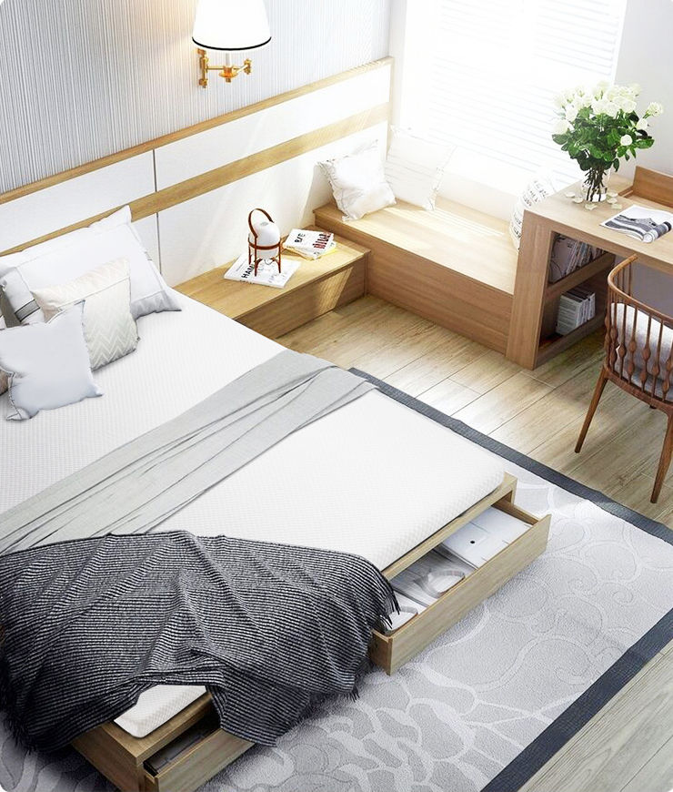 利用連接式設(shè)計(jì),將房間中的飄窗、書(shū)桌、床、床頭柜等家具整合在一起,從風(fēng)格上達(dá)到統(tǒng)一,極致利用空間。