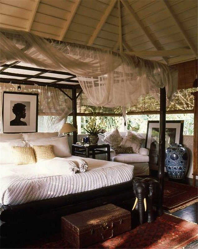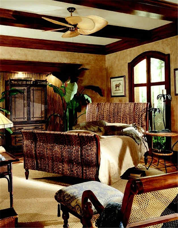 東南亞臥室里,木質雕刻的樹葉造型吊扇、古典吊頂燈等,都做得比較雅致,配色接近原始材料,也喜歡給燈具裝點流蘇小飾物,還有藤、竹、草、原木、椰子殼、貝殼等天然材料。