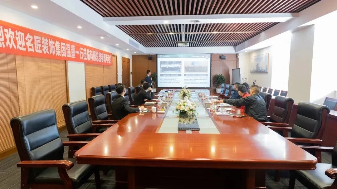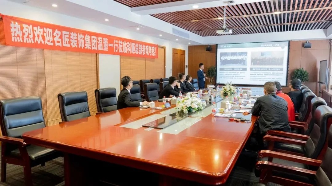 近日,名匠裝飾集團董事長溫浙濤(以下簡稱溫董)一行到訪科順股份集團總部,并在科順民建集團總裁徐汝意(以下簡稱徐總)帶領下交流考察。